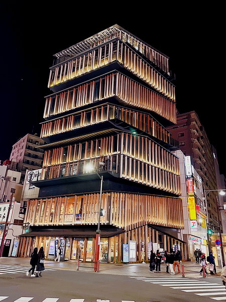 雷門馬路對面有棟非常醒目的建築物,是由建築大師隈研吾設計的淺草文化觀光中心;最強賣點是8樓有「免費展望台」和付費咖啡廳,可以由高處眺望淺草寺和晴空塔,私房淺草景點千萬別錯過啦…..