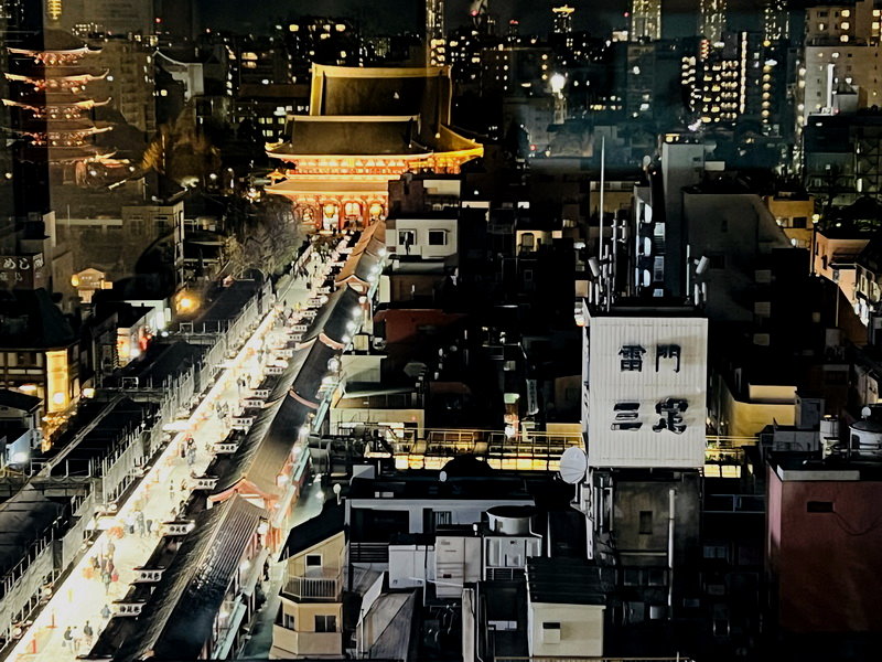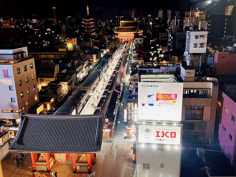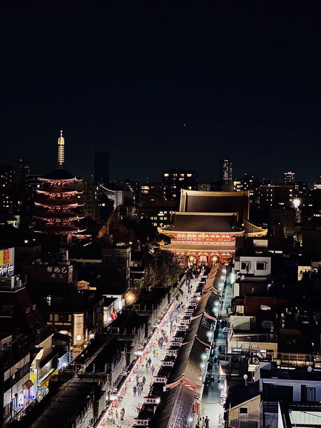 雷門仲見世通的俯拍景色,五重塔及寶藏門清晰可見,夜晚,雷門街道上燈火通明,營造出與白天截然不同的夢幻氛圍。