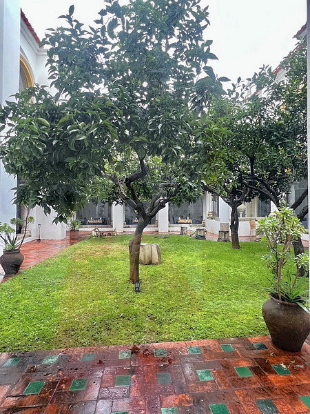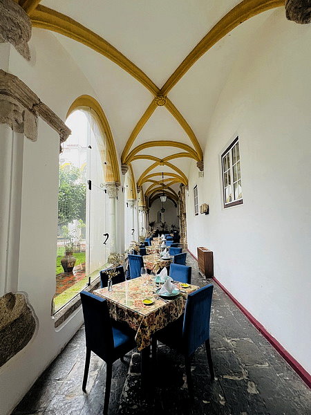 有一處迴廊還擺置餐廳的桌椅供餐或下午茶呢!