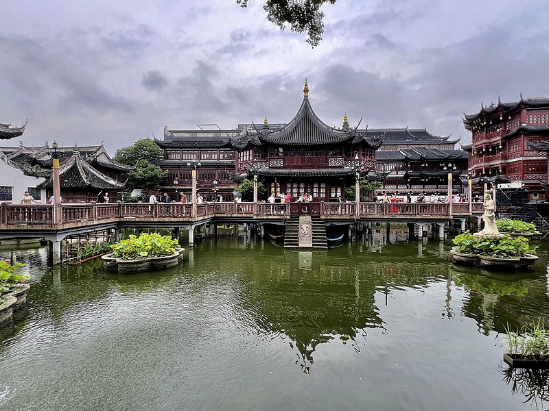 湖心亭茶樓翼然而立在水中央,有九曲橋可以通達,被譽為"海上第一茶樓",是上海歷史最悠久且最具盛名的茶樓之一,也是現存古建築景觀與最早商會的所在地。