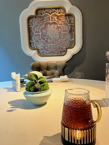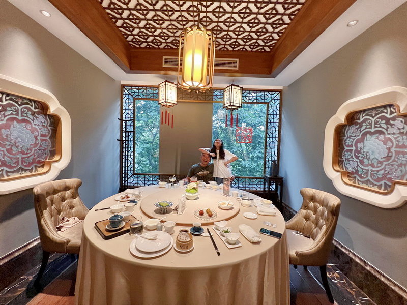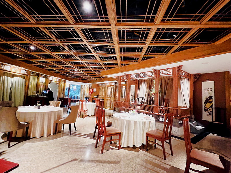 餐廳的裝潢靈感來自明清時期,紅燈籠、老木頭家具元素等營造出古樸韻味,在傳統民樂以及字畫的襯托下,有著濃厚的文化氛圍。聽說晚餐大廳裡還有民樂演奏,古箏、琵琶、二胡,絲竹之音悅耳,古色古香的氣息滿滿噹噹,房間也很有格調。邊吃邊聽,彷彿來到了舊時的茶館一樣,很有氛圍。