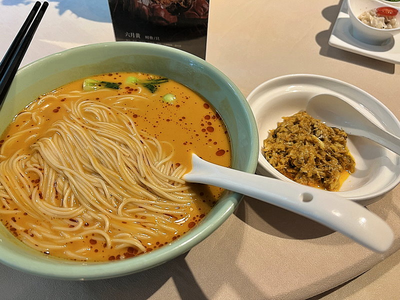這裡的蟹都是經過精挑細選的,每道菜都有蟹原料。這碗麵應該是蟹黃麵,蟹黃麵也是滬杭美食料理,K導擔心W吃不飽先點來分享吧!