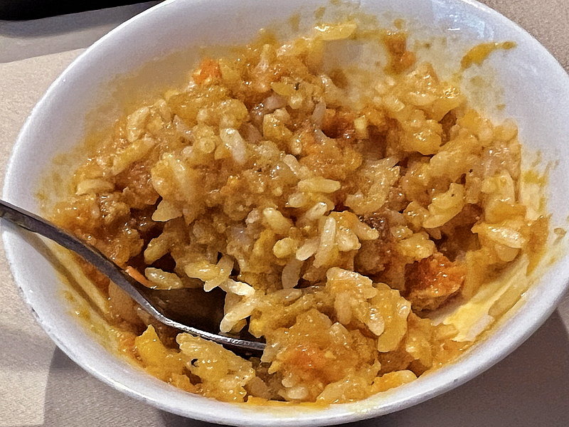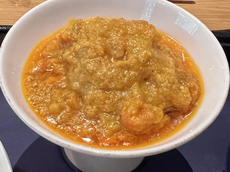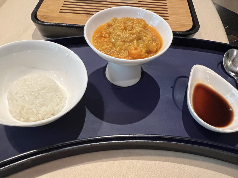 蟹黃油撈飯拌好後非常好吃,禿蟹膏蟹黃在一起,拌在飯裡味道非常美味,可以先吃原味的,後來再放一點點醋味道更加鮮美。
