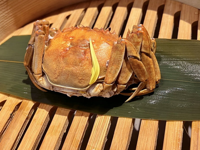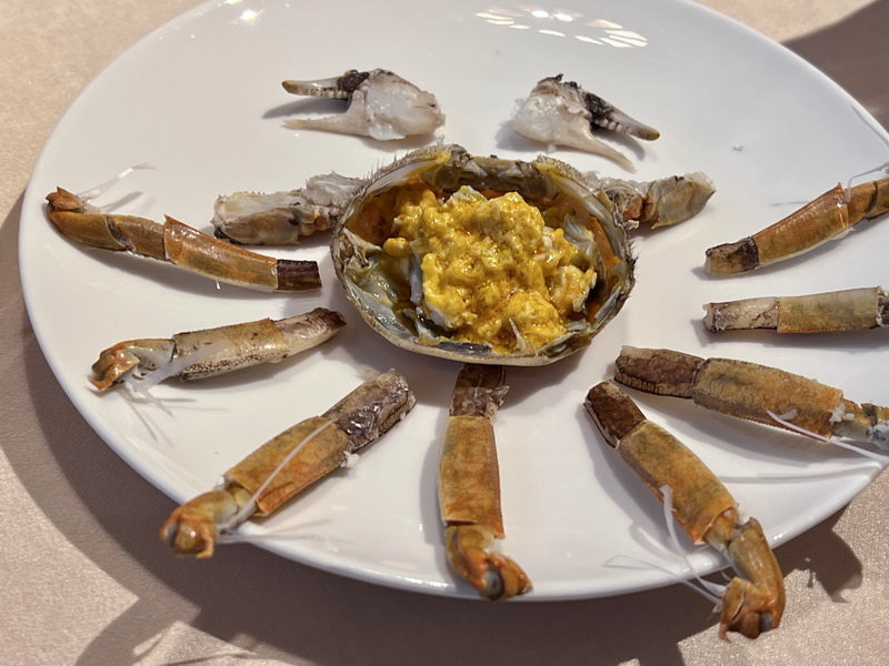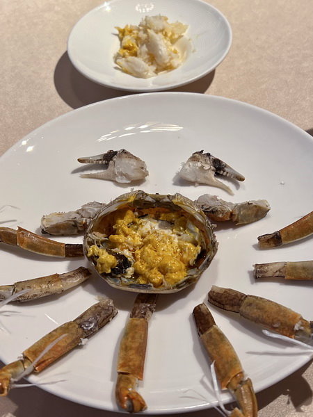「蒸六月黃」這個季節特有大閘蟹,螃蟹再去殼換殼,蟹黃程油脂妝,非常好吃,服務生幫忙把大閘蟹先拆解好,吃起來更容易、味道更鮮美。