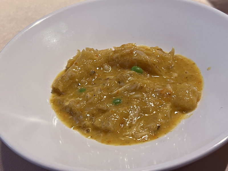蟹肉黃悶翅~套餐裡的魚翅料理;蟹的精華、腿肉絲、蟹黃與魚翅勾芡,相當濃郁的蟹香,入口可說都是鮮味,吊足了口慾,欲罷不能……..
