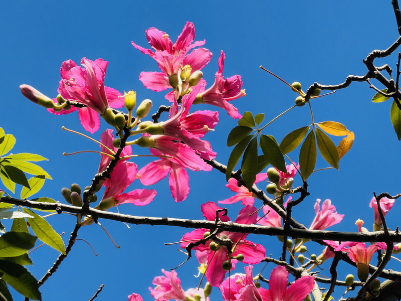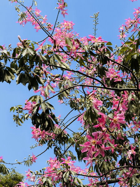 花瓣為裂五瓣,呈現淡粉色至洋紅色,近花蕊處呈現淡淡牛奶白;每逢開花時,藍天白雲下綠葉點綴粉紅花瓣,完勝一幅美麗的風景畫,令人留連忘返,美不勝收。