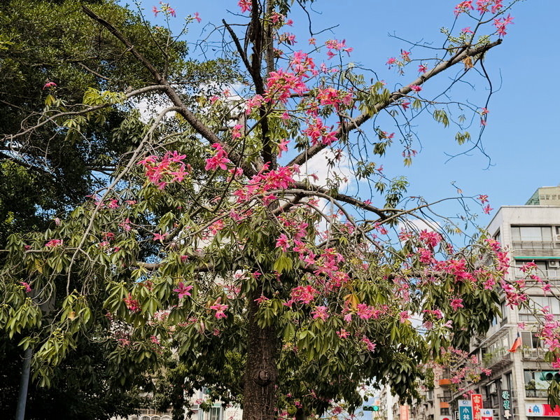 9月底的榮星花園周邊,人行道上粉嫩嬌豔的美人樹花朵紛紛綻放,淡粉身影靜立藍色天空下,迎著陽光照射出無限旖旎,尤其在西風吹拂下,美人樹婀娜多姿隨風搖曳,令人著迷駐足。