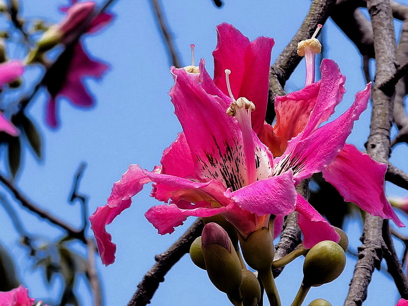 美人樹花多先葉或與葉同時長出,大而豔麗,紫紅、紅色或淡粉紅,徑10 ~12公分,萼杯狀,花瓣長橢形,基部常有乳白色斑點。