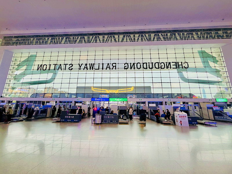我們走遍二樓也沒辦法拍攝到成都高鐵的標誌,卻只看到相反的字體。從成都坐動車到松潘不到兩小時,大行李還有遊覽車運送,老人家這樣出遊較輕鬆啦!