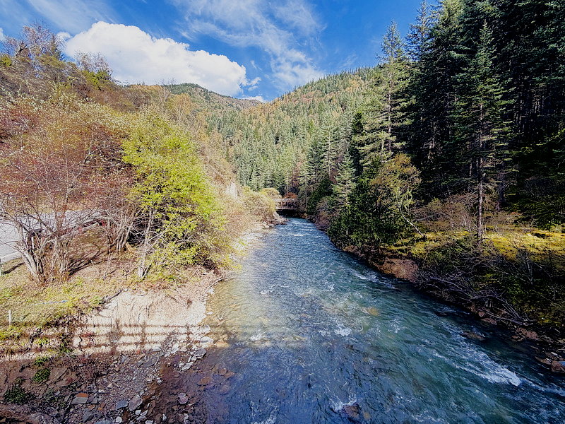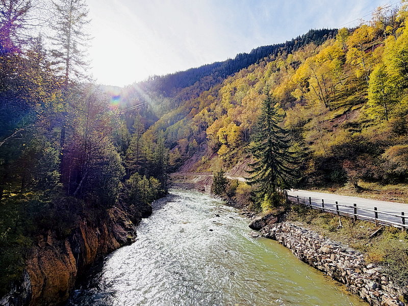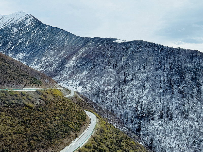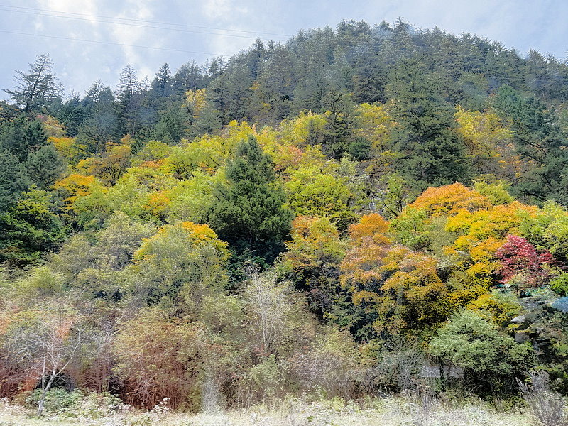 這40公里的盤山公路,從神仙池一直延續到九寨溝,沿途的車輛很少,之間鬱鬱蔥蔥的樹林,空氣中夾雜著大自然的氣息,空氣清新,沿途有些殘雪似乎有冬天的寒意啦!