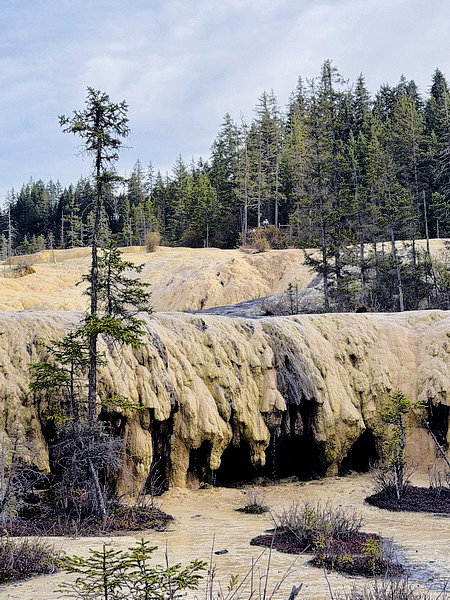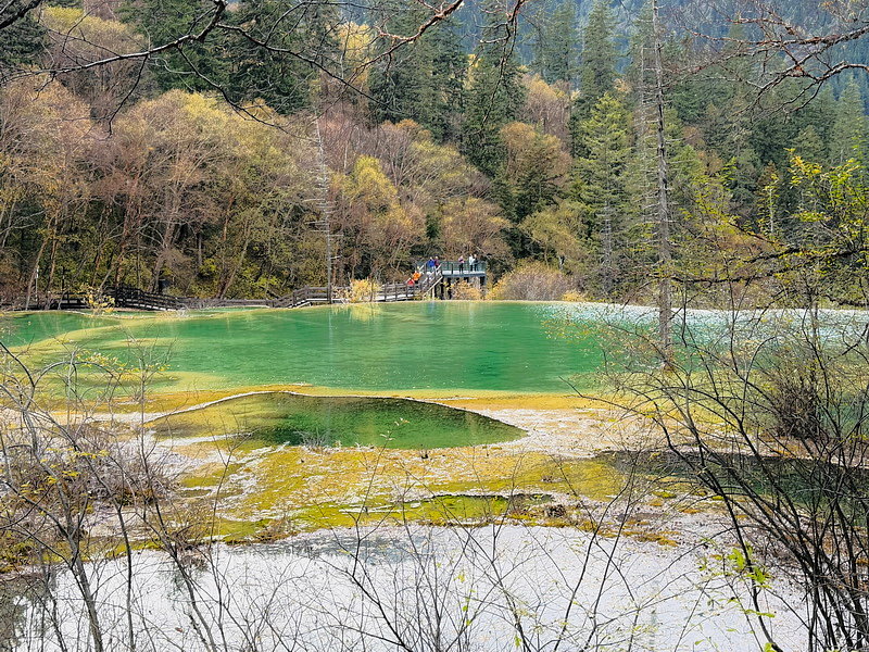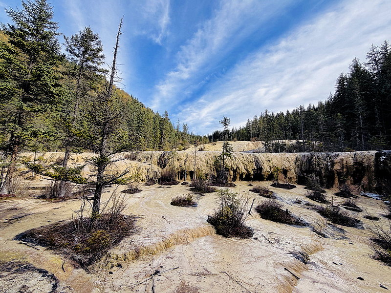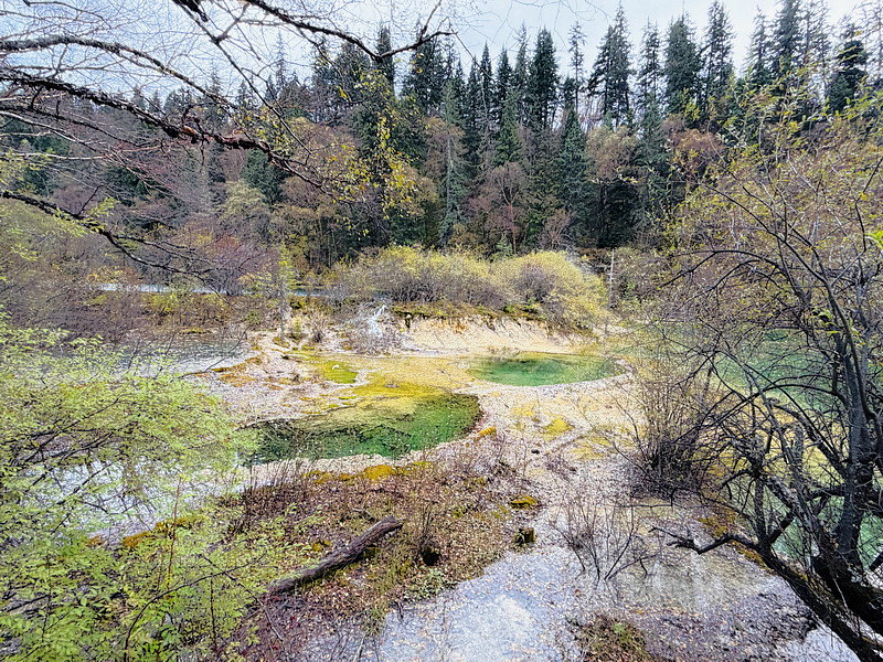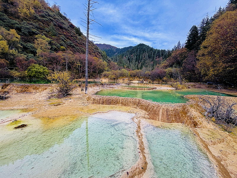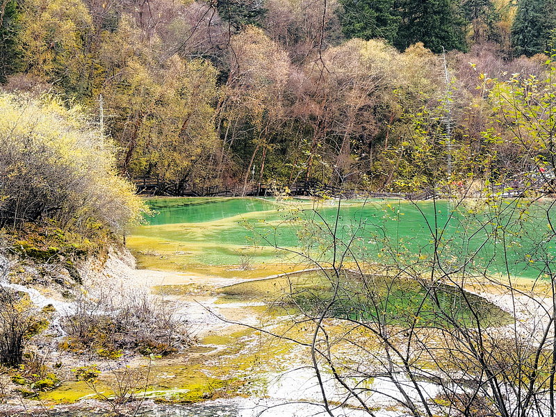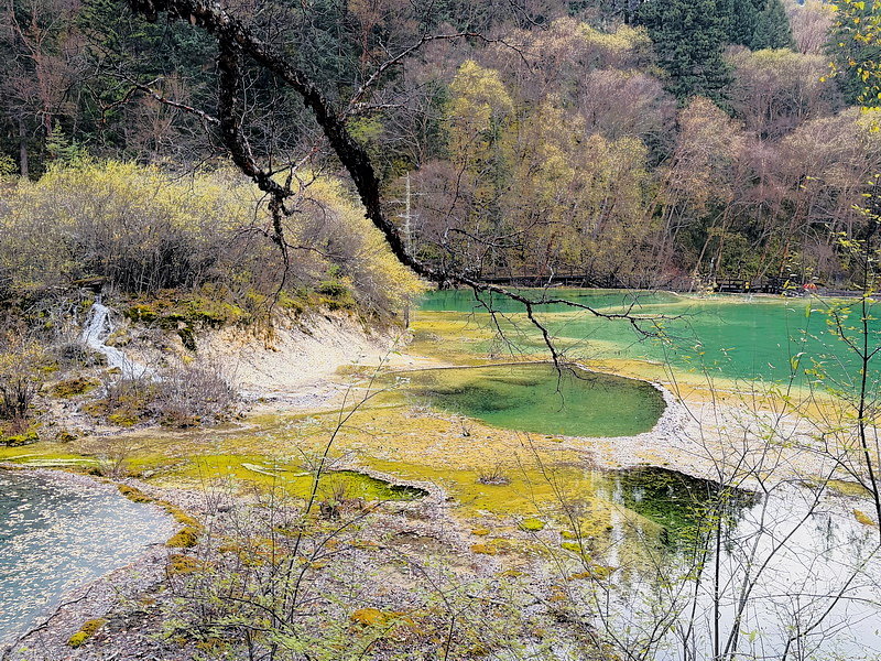 這兩種地質形態呈交替分佈,在陽光的照射下,海子像鎖進盤曲樹枝的綠色寶石、鈣化池像佈滿裙邊的玉盞金蓮。