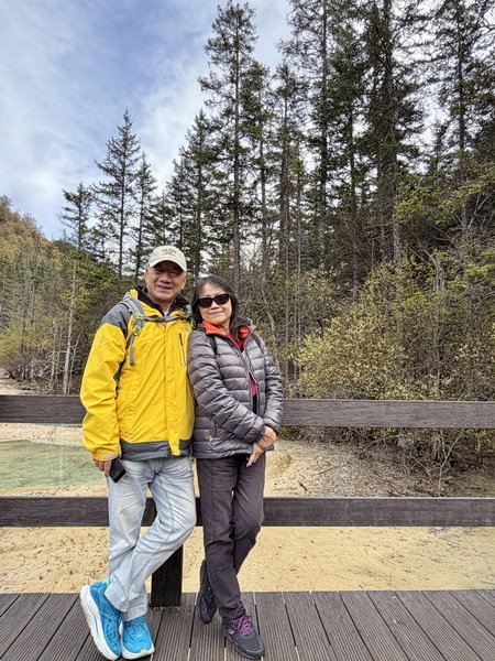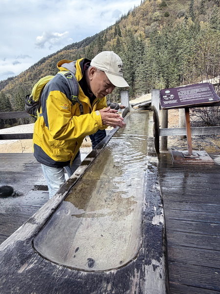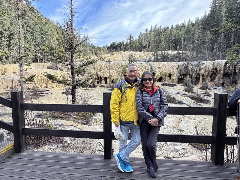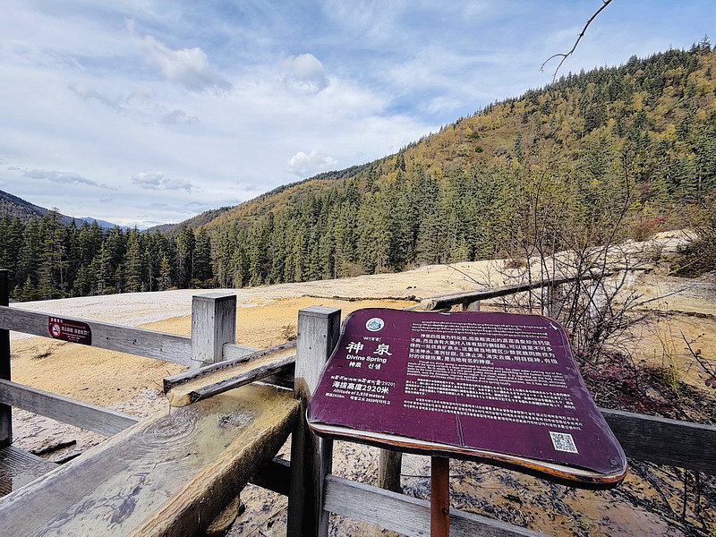 進入神仙池景區,沿著古樸的木製棧道慢慢前行,神仙池景區是一個集合九寨溝水的秀美和黃龍瑤池的神奇,整個景區被浩瀚無邊的原始森林包圍,四周地勢險峻,海拔4000米以上的山峰就有10多座,峰巒疊嶂,曲澗幽深,雲霧繚繞,給人一種空靈神秘、寧靜幽遠的感覺。很適合擔心高山症又爬不了黃龍但又想看鈣化池的中老年人來旅遊喔!