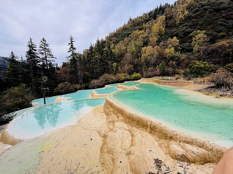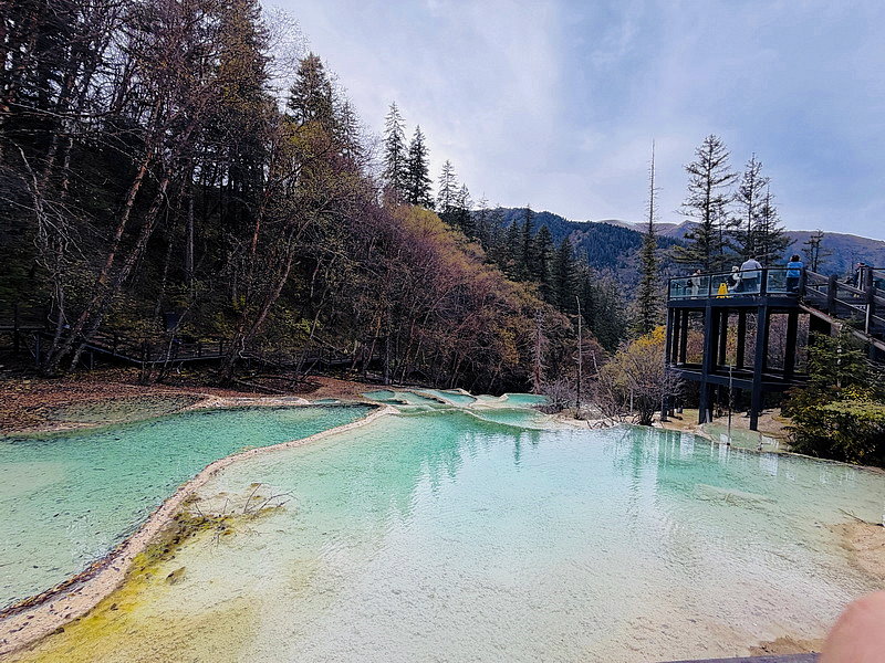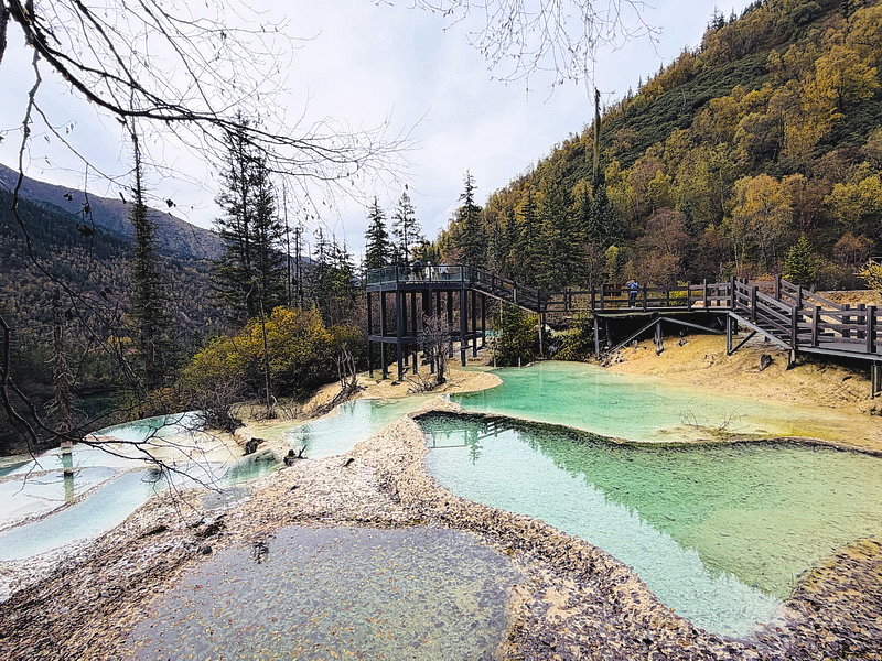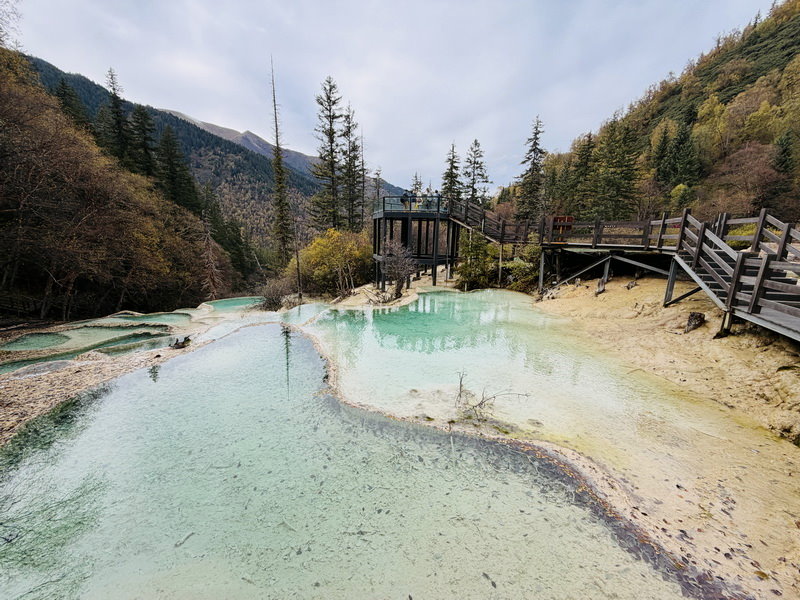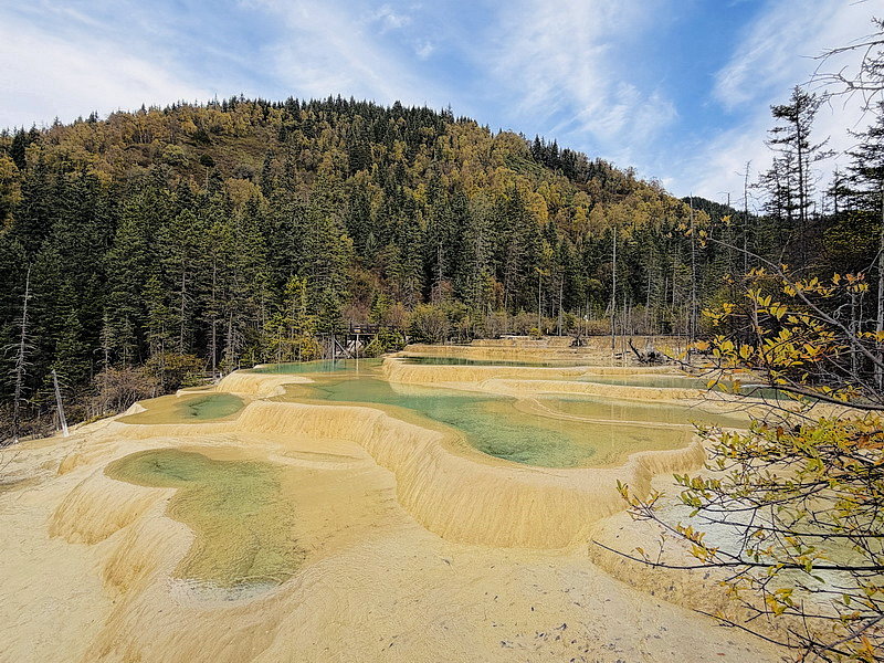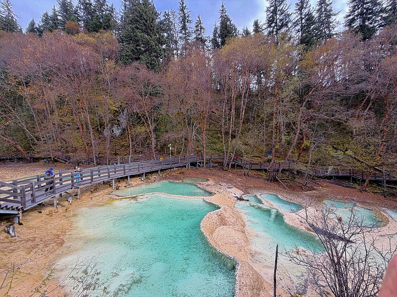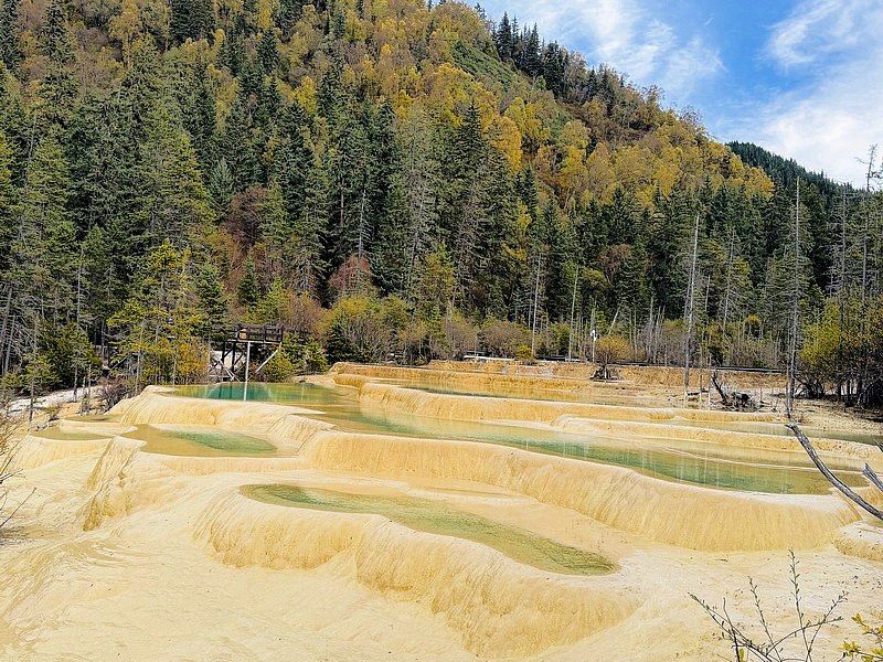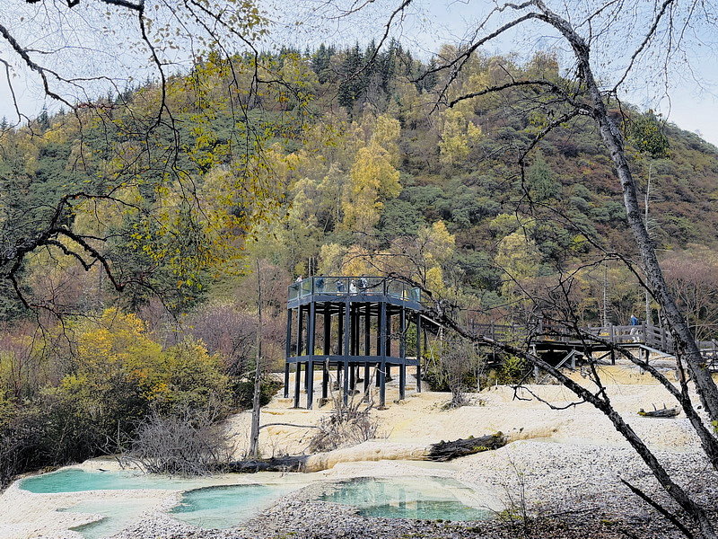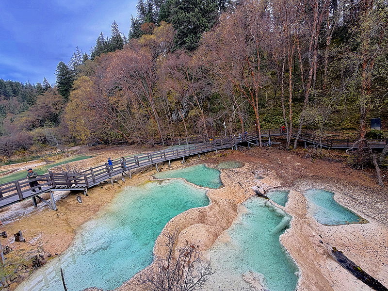 沿著木製棧道一路所見峰巒疊嶂,曲澗幽靜、雲霧繚繞,給人一種恍如隔世、寧靜悠遠的感覺,在綠色的松柏和紅樺的枝條間,不時有可愛的小松鼠穿過,成片的山坡被黃色、乳白色的鈣質所包裹,形成了奇特的盆狀鈣化池和鈣化坡,層層堆疊,池中的水色發出獨特的「仙女藍」很有些不食人間煙火的味道。