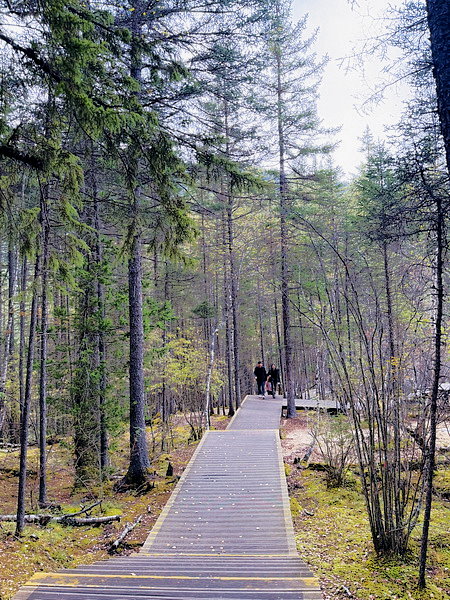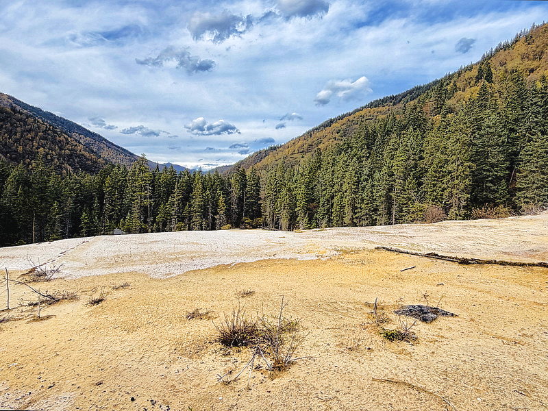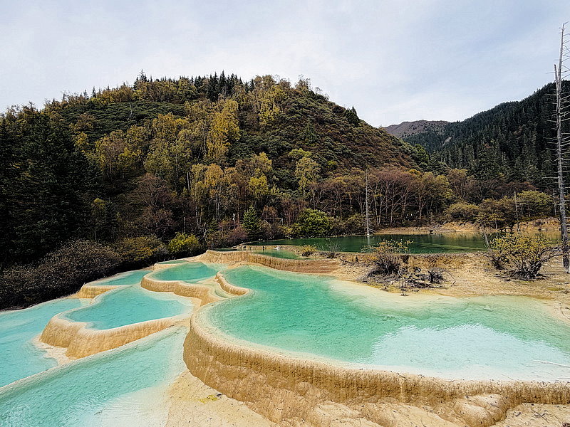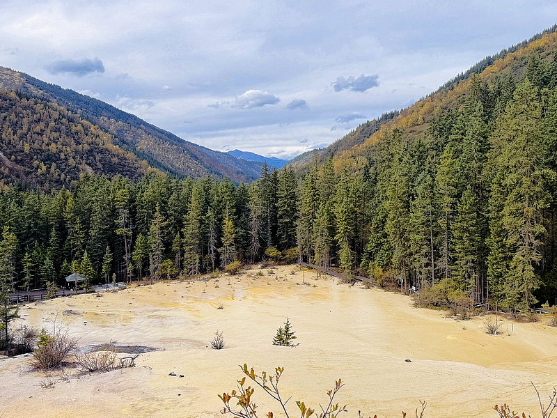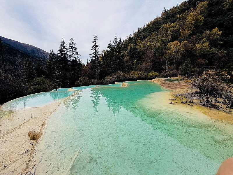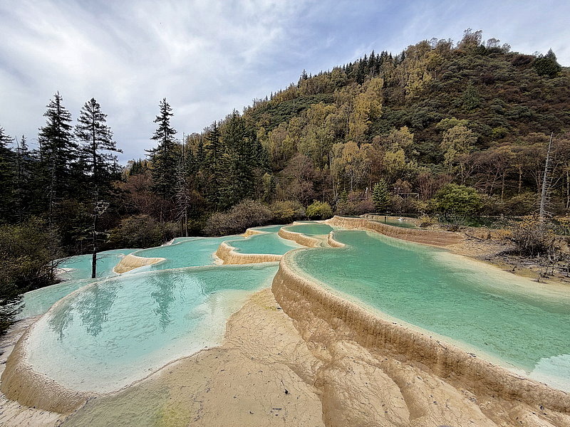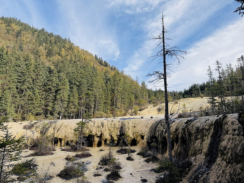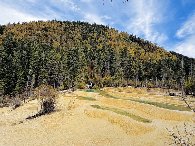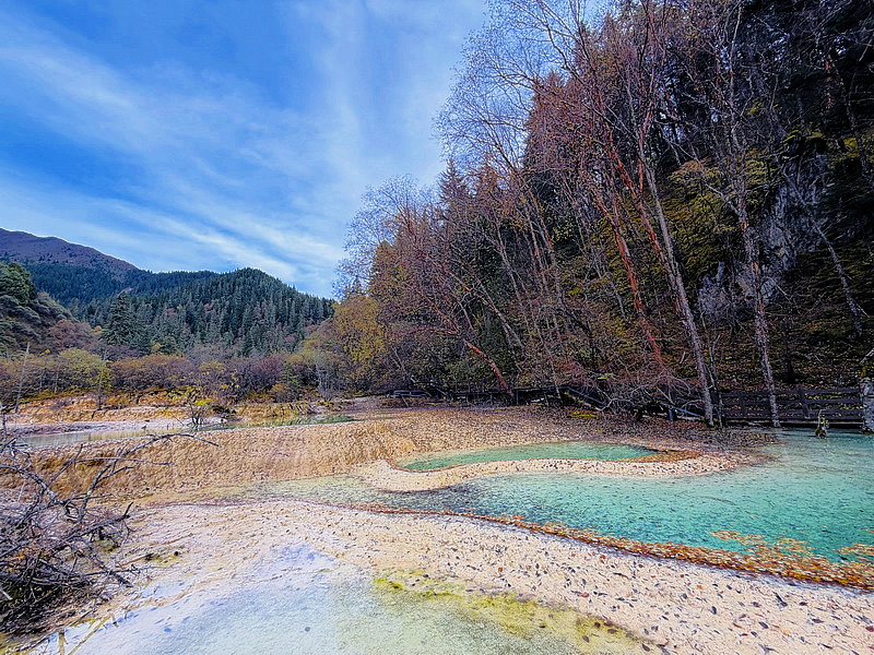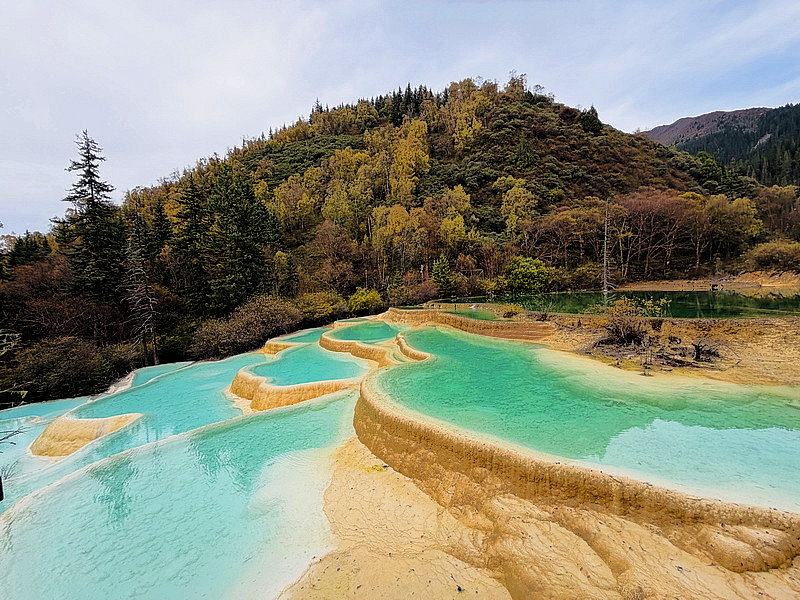 沿著木製棧道一路所見峰巒疊嶂,曲澗幽靜、雲霧繚繞,給人一種恍如隔世、寧靜悠遠的感覺,在綠色的松柏和紅樺的枝條間,不時有可愛的小松鼠穿過,成片的山坡被黃色、乳白色的鈣質所包裹,形成了奇特的盆狀鈣化池和鈣化坡,層層堆疊,池中的水色發出獨特的「仙女藍」很有些不食人間煙火的味道。