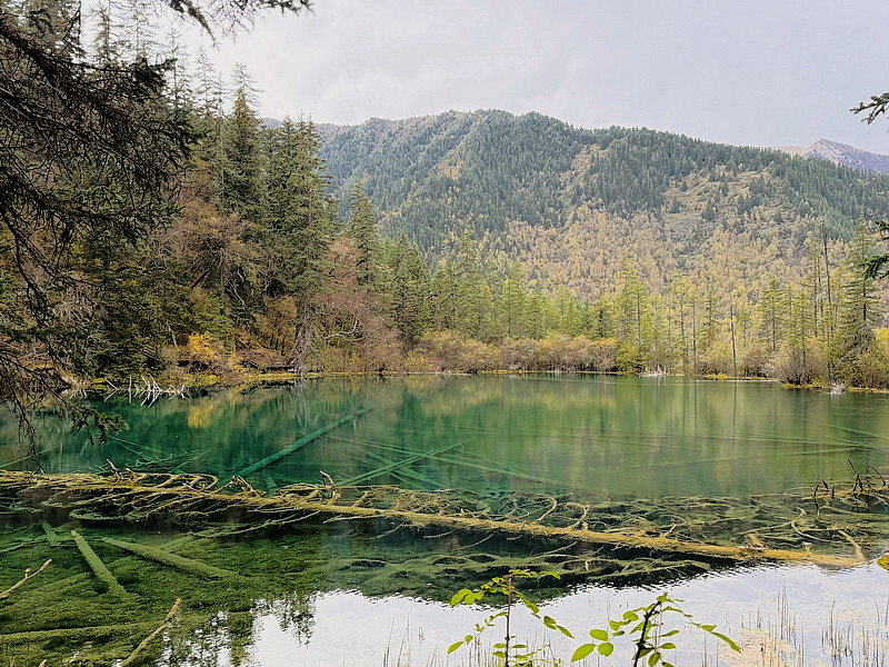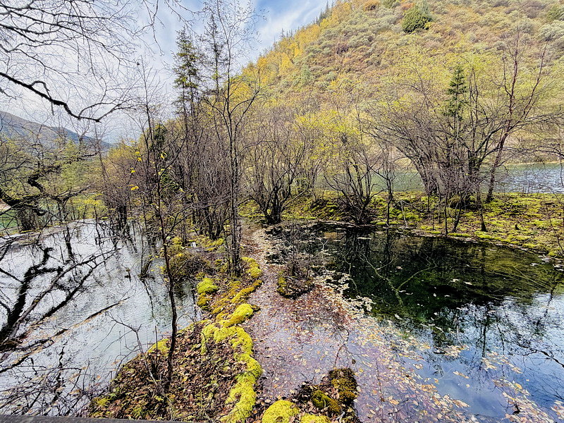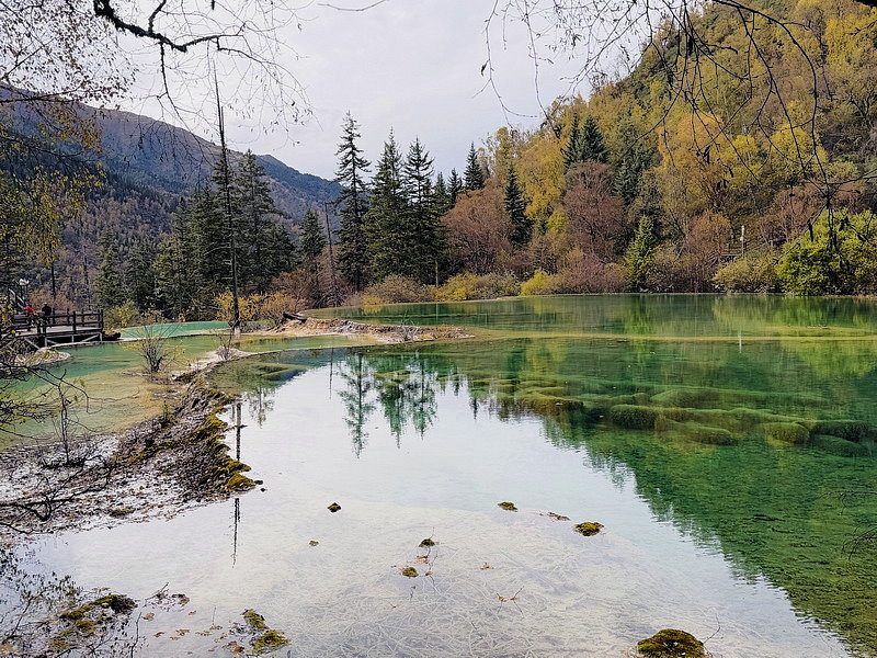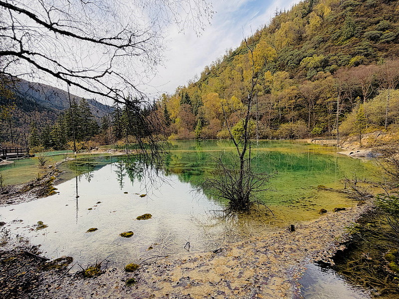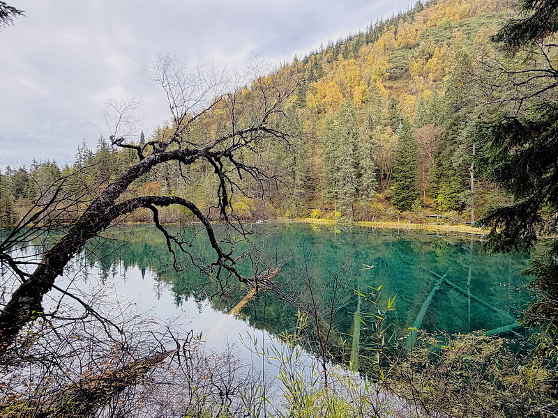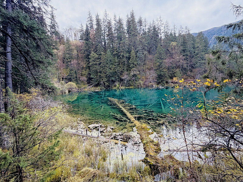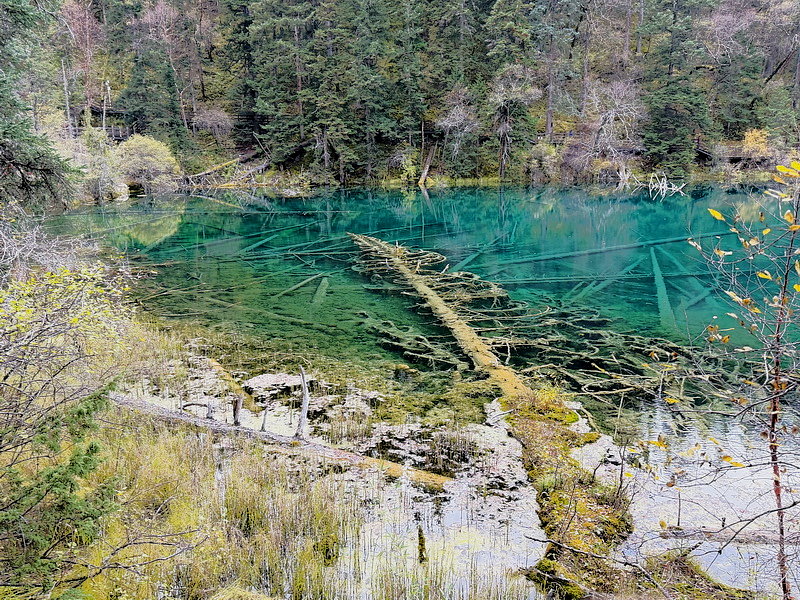 青龍海和神蛙海都與九寨溝的大小海子如出一轍,枯木靜臥水底,青苔遍舖水岸,全沒了鈣化痕跡,這一現象就連地質學家也難以解釋。