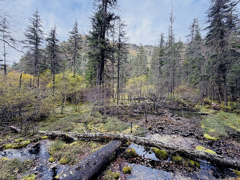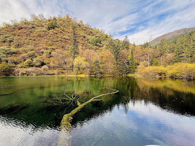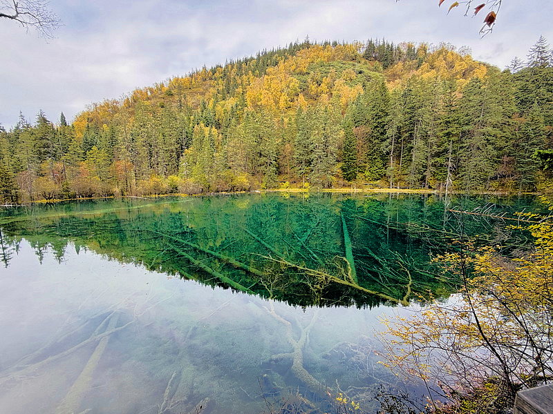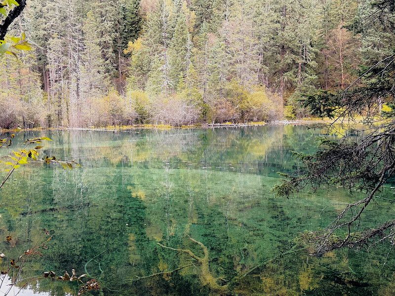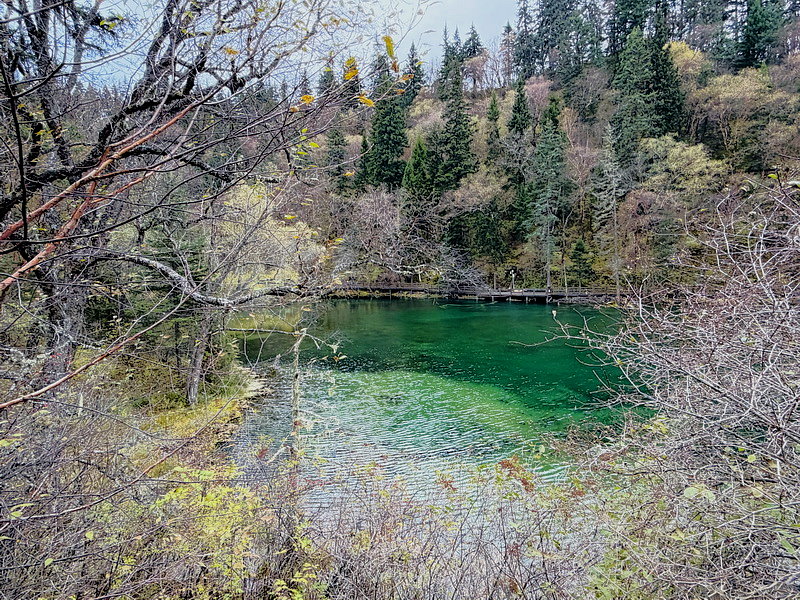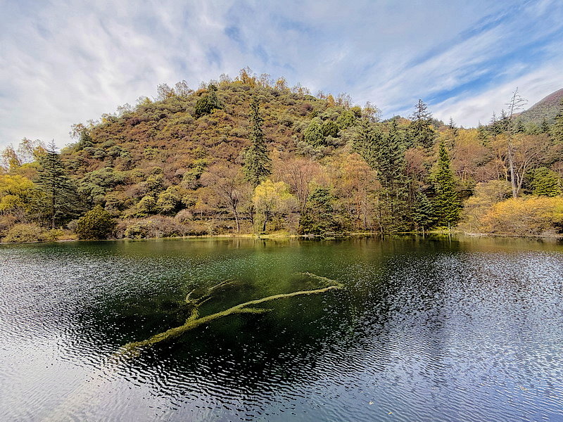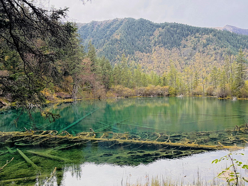 青龍海和神蛙海都與九寨溝的大小海子如出一轍,枯木靜臥水底,青苔遍舖水岸,全沒了鈣化痕跡,這一現象就連地質學家也難以解釋。