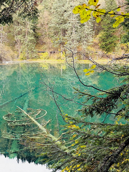 當金秋來臨時,湖畔五彩繽紛的彩林倒映湖中,與湖底色彩混交成一個異彩紛呈的彩色世界。