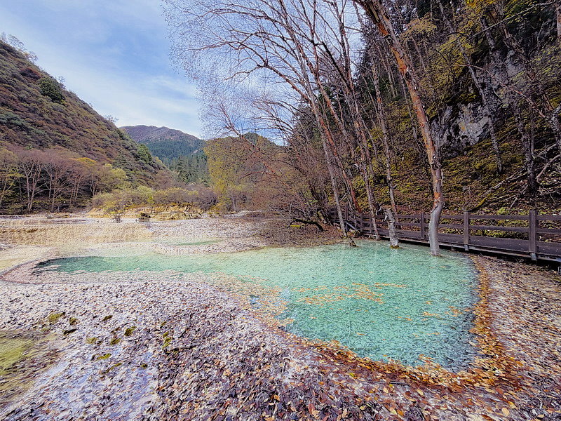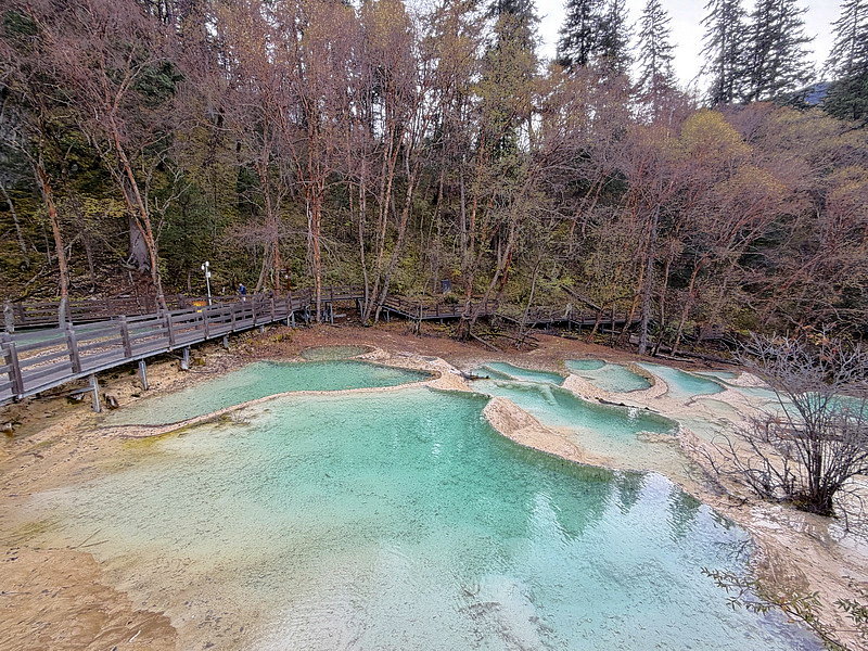 沿著古樸的木製棧道慢慢前行,成片的山坡被乳白色鈣質所包裹,形成奇特的盆狀鈣化池和鈣化坡,池中的水色發出一種獨特的"九寨藍",很有些不食人間煙花的味道。