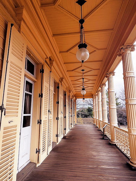 舊岩崎邸庭園的洋館一樓的陽台是義大利托斯卡尼風,二樓的廊柱則是希臘愛奧尼亞風,讓人感及受到歐洲建築的偉大與品味。