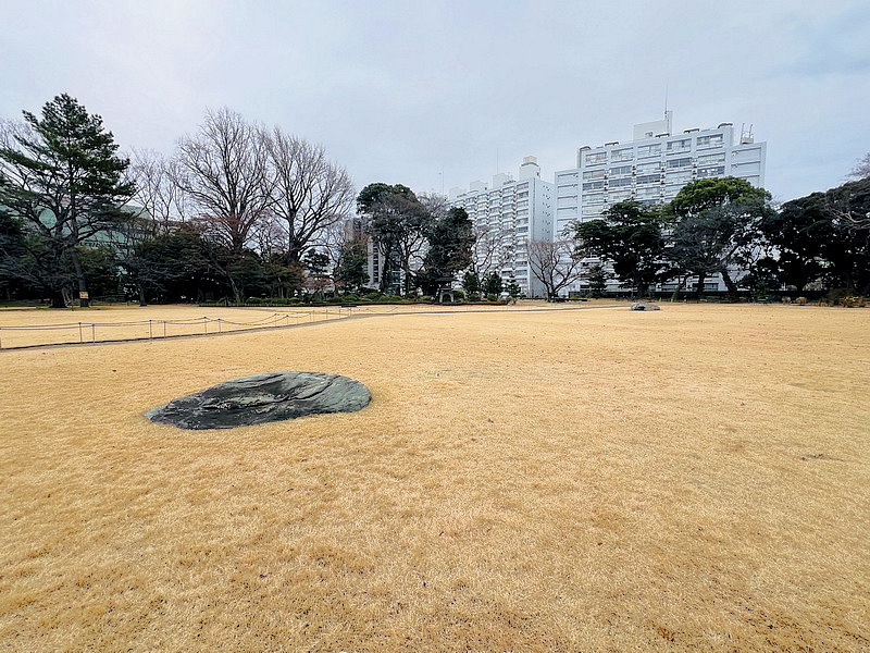在草坪後方高大樹木的樹根下,仍保留著石砌結構和賞雪燈籠的遺跡,營造出日式庭園的氛圍。