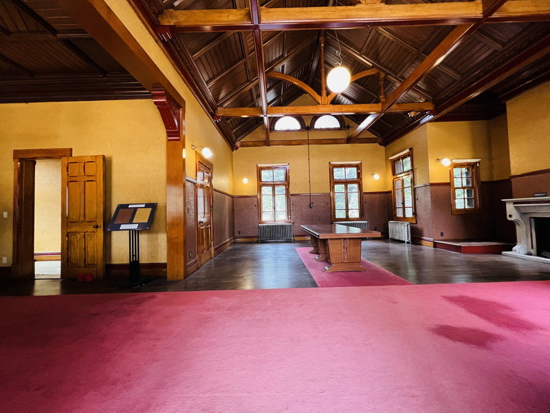 想像明治時代的賓客在豪華的洋館享用晚宴後,在宅邸主人的招呼下,有如前往秘密基地般穿過地道,在撞球間裡敲上幾杆,最後坐在小屋前或庭院中的露天座席,於月光下小酌,欣賞不同於雄偉正面,洋館背後的纖細線條,想必是愜意無比吧! 撞球室内部有貼有貴重的金箔紙,所以僅能從外面拍照,不能入內!