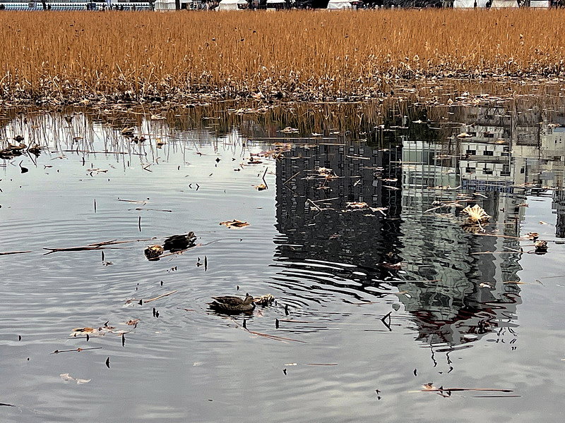 每年夏天,南部的池塘裡長滿了荷,幾乎完全覆蓋了整個池塘。但1月的池中長滿著枯枝,不知道是否蘆葦草?