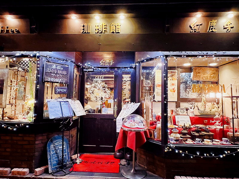 「珈琲館 紅鹿舎」店門前褪色的招牌與復古的玻璃展示櫃,和周圍的現代風景形成鮮明對比,進入店裡可以感受到穿越時光的復古風格,有著濃厚的時代感。在1960年代左右的咖啡館只供應咖啡、紅茶、三明治和蛋糕的年代,1957年創業的紅鹿舎希望提供更多選擇,於是開始開發各種新菜單。如今在日本喫茶店代表菜色之一的披薩吐司,就是由他們發明的。