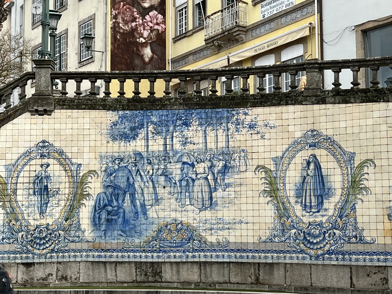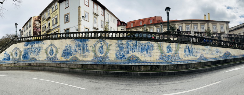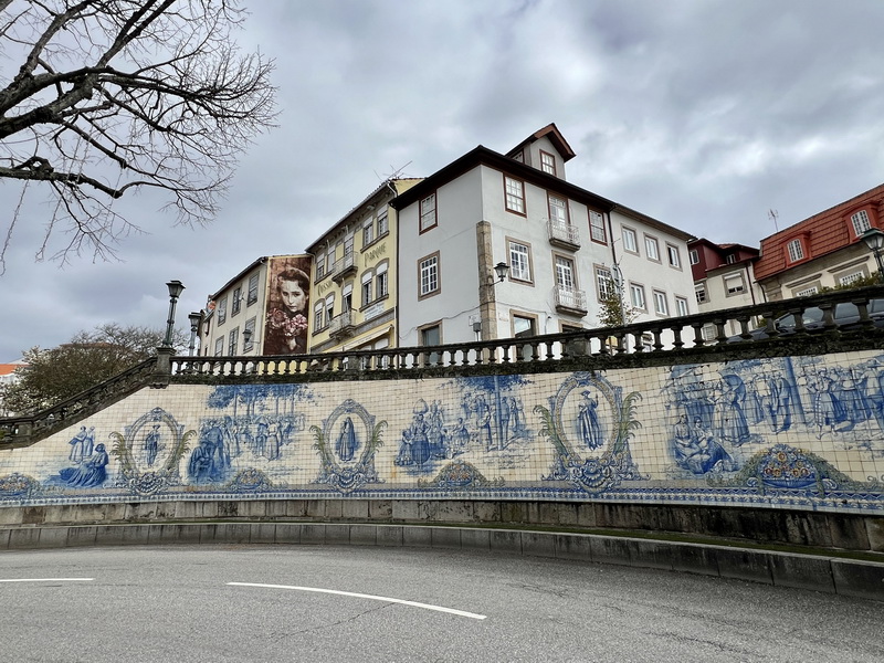共和國廣場旁有一個大型「藍瓷歷史牆」(Painel de Azulejos),古老的城牆輕聲低語著羅馬時代的傳說與歷史的滄桑。