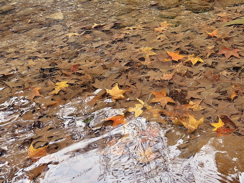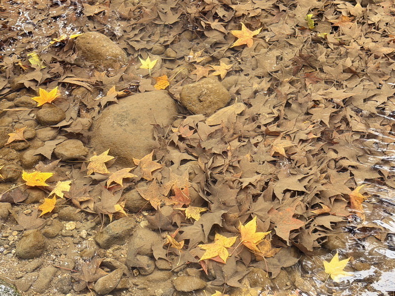12月底溪水中被飄落的楓葉覆蓋著,溪水就成為淡淡的紅棕色喔!