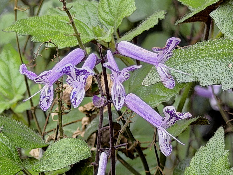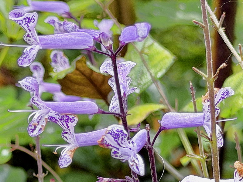 卵形葉對生,葉表面光滑濃綠、葉背紫紅色。穗狀花序開放在枝條頂端。淺紫至深紫花色十分醒目,花朵上散佈紫色斑點。