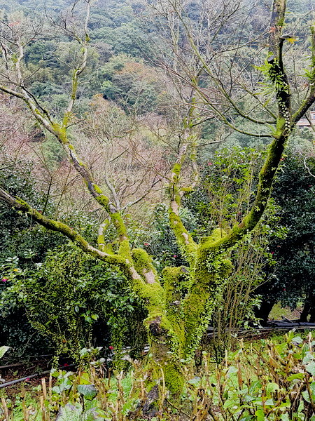 陽明山大概長期陰雨,粗壯的樹幹被附生植物覆蓋著,彷彿穿著綠色的外套呢!