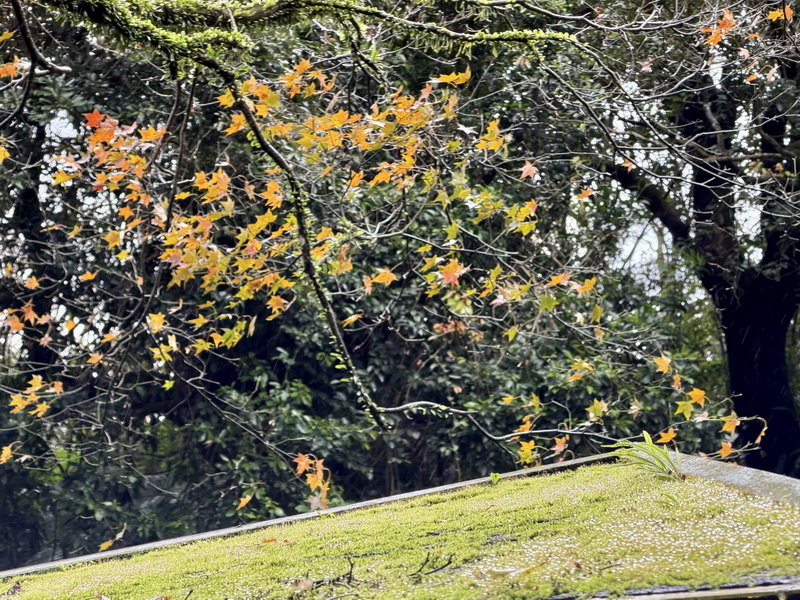 12月底的秋楓葉片,在鋪著綠意的水珠屋頂上輕輕地撫過,彷彿宣告冬天的來臨……