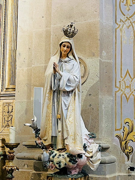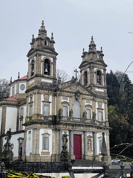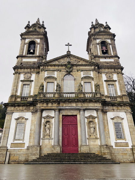 苦路的終點來到朝聖所,正門緊閉但沿著教堂繞一下就找到開放進出的側門,內部可以免費參觀,裡面氣氛很寧靜。該座教堂建於1784年與1811年間。花崗岩的建築有粉刷的石膏外牆,以外露的石雕包圍。正立面採用傳統的葡式粉牆和石材鑲邊風格。左右是兩座塔樓,頂部有三角形的山牆,正門旁6公尺高的柱子之間有壁龕,矗立著先知耶利米和以賽亞的雕像;山牆下中間有昂若六世的徽章。