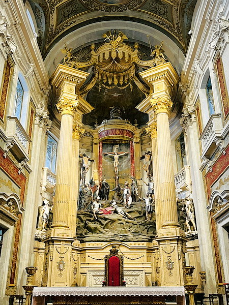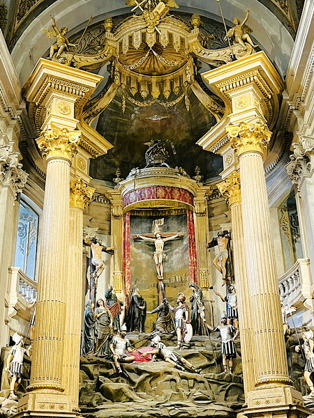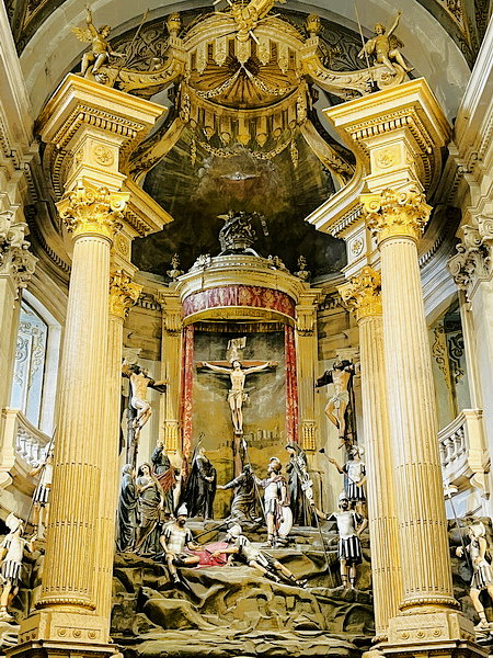 主祭壇覆蓋金色天蓬,當中呈現加略山場景。(加略山就是耶穌的墳墓與祂復活的地方)