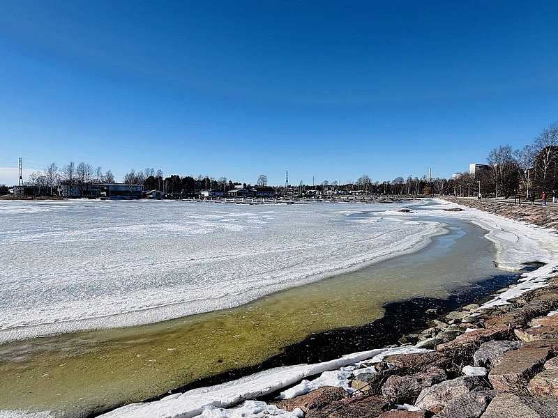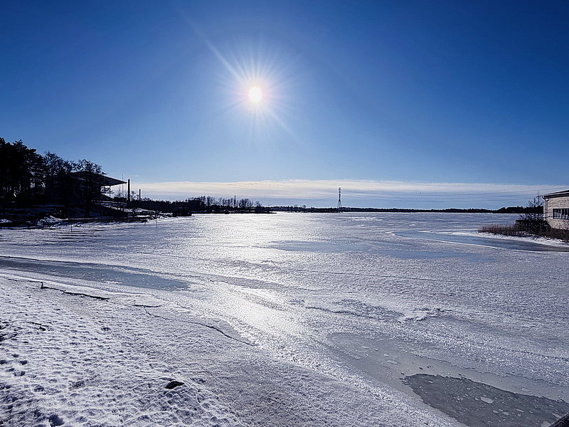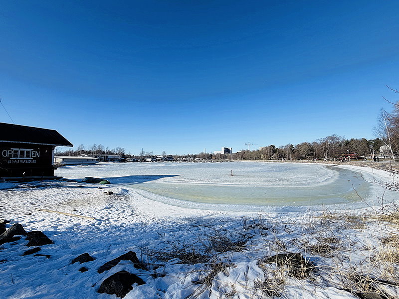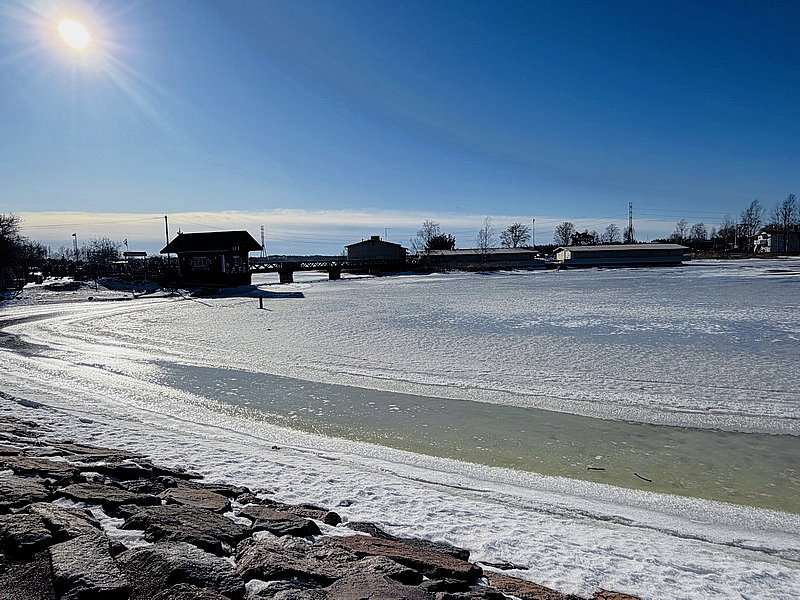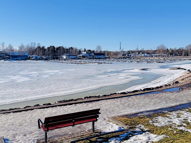 從紀念碑往前走不久,過個馬路對面看到一片像湖泊的水域,只是水面都結冰,原已為以為是湖,卻其實是海灣!!