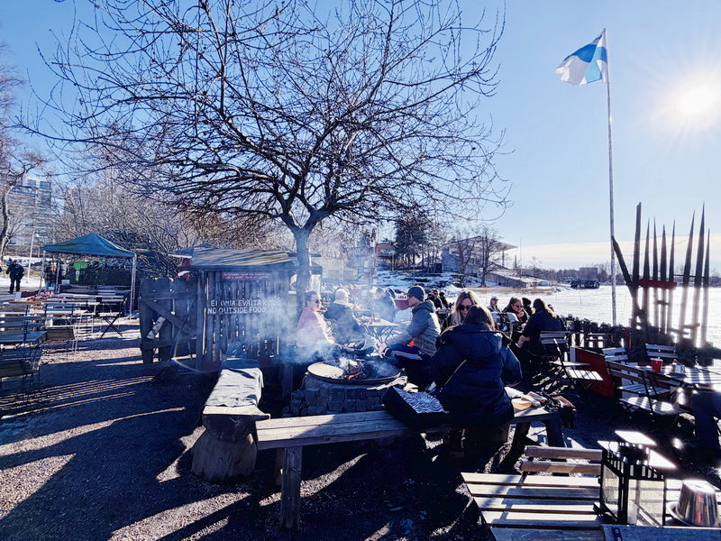 戶外用餐區燒著柴火,有好多坐著品嘗佳餚,溫暖著欣賞海之雪景的客人。