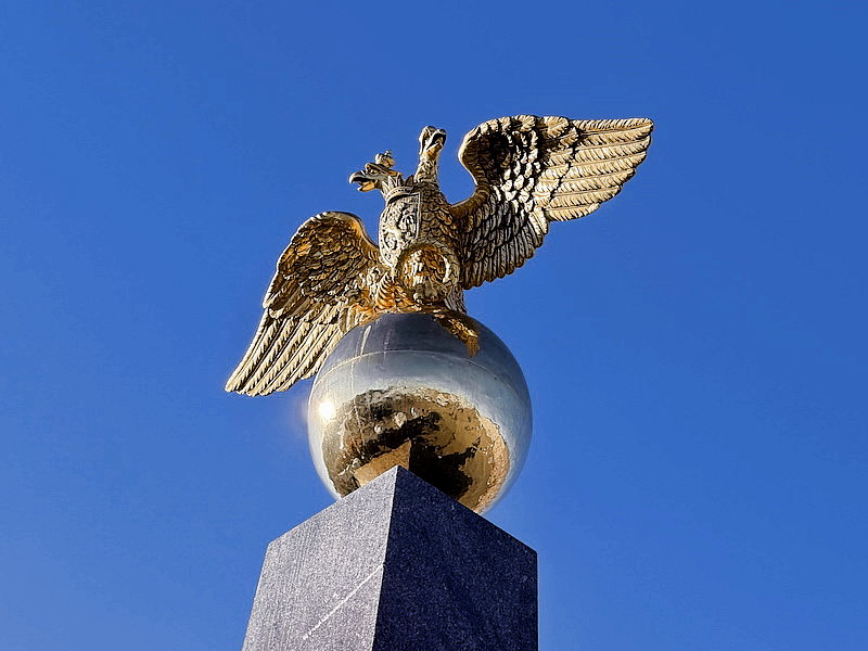 方尖碑頂上是一隻古銅鑄雙頭老鷹和站在地球上。雙頭金鷹象徵著榮光,沙皇時代強大的陸權國家,俄羅斯帝國標誌。象徵雙頭金鷹雄視東西兩邊,代表俄羅斯是一個地跨亞歐兩大洲的國家;雙頭鷹由來可追溯到公元15世紀。原是拜占庭帝國君士坦丁一世的徽記。後來亡國後拜占庭公主索非亞許配給了莫斯科大公伊凡三世,索菲婭由此佩戴著拜占庭帝國威嚴的雙頭鷹徽記來到了俄羅斯。1497年,雙頭鷹作為國家徽記出現在了俄羅斯的國璽上。
