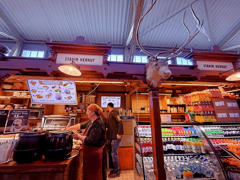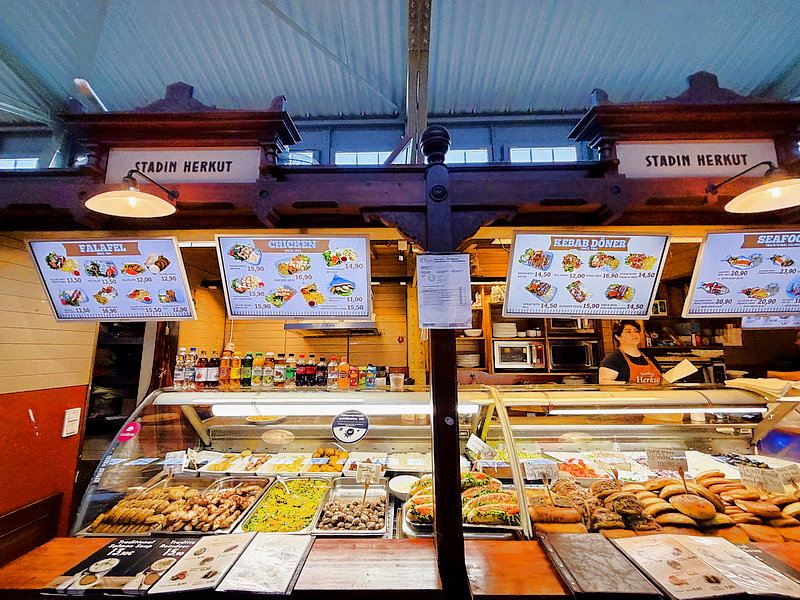 攤位賣的東西林林總總,涵蓋了各種新鮮食材、熟食等,從當地的海鮮、肉類到芬蘭的「特色食品」都能找得到。另外,這裡還有不少小攤賣咖啡、甜點和餐食,甚至有些連鎖店都在這裡開設「迷你」分店,主打一個地方給人多層享受。兩側走道上的小攤位都是木製的,幾乎每一攤都裝飾得特別精緻,很有歐洲的感覺。每一個攤位前都有一盞小小的吊燈,招牌統一都是白色的小牌子,這樣看起來特別乾淨整齊。