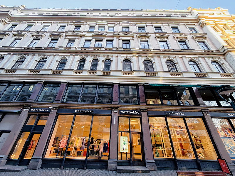 Halonen、Kankurin Tupa、Terhi Pölkki 、Longchamp、Kalevala Koru、Aarikka Oy、Iittala…等芬蘭精品店都開在這條街上,這個夾在兩條購物街之間的埃斯普拉納迪Esplanadi公園就成了大家歇歇腳、喝杯咖啡的好去處。公園是由建築師卡爾·盧德維格·恩格爾設計的,並在1818年開放。建築物超氣派又有氣勢。這建築物群因為以前文字不普遍,用圖像來分區,這區就是獨角獸喔!