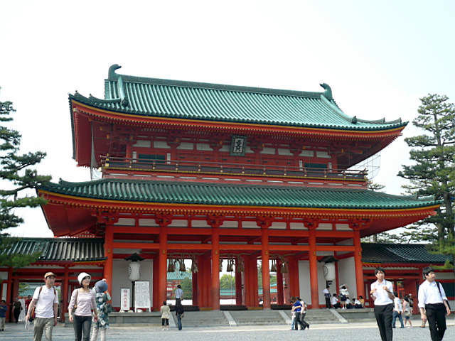 公元1895年,為記念平安遷都1100年而建。其造型按平安京(公元794年)八分之五繪圖設計,綠色和朱色相映的主殿後面有三個池塘和四座庭園。