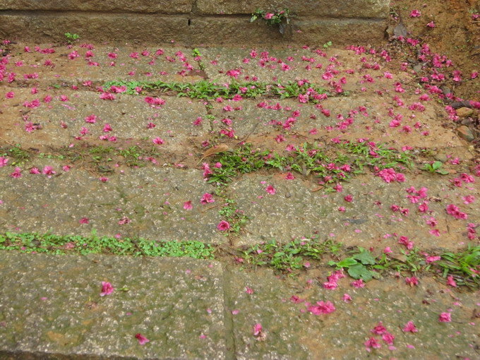 步道上灑落著許多櫻花瓣,空氣中似乎充滿著浪漫的氣息呢!
