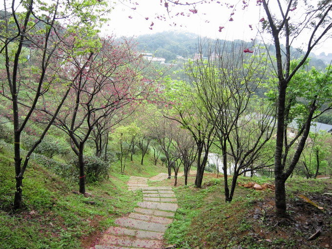 八重櫻上下照片是 紅(白)色重瓣碧桃花 八重櫻(重瓣山櫻)在山坡下櫻花步道兩側 已長葉子 山櫻花下一張