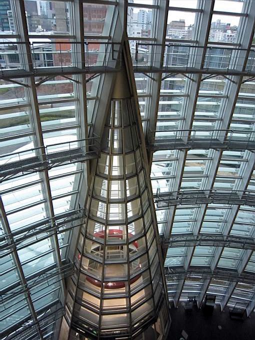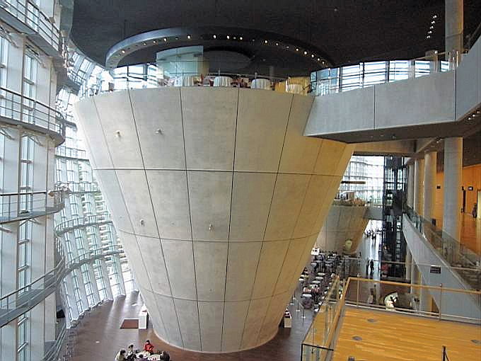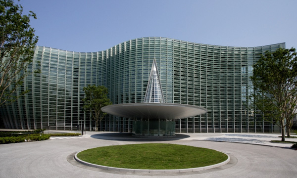 國立新美術館由日本建築師黑川紀章設計,以共生為理念,強調所有建築都是為配合人與自然的融和而建,用玻璃引入自然光,強調節約能源。