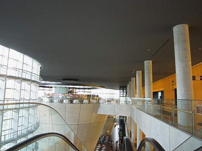 美術館為3層樓高的建築,大廳天井的挑高設計,讓整體具有開闊且開放的感覺。像波浪般曲線的玻璃窗,讓陽光充分灑進室內,帶動出一股宛若置身於海底般的神秘感。
