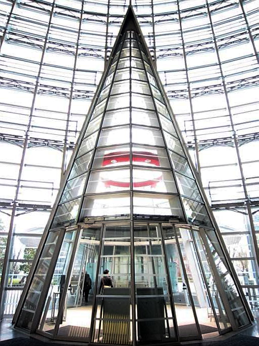 國立新美術館入口~美術館是外觀全部使用玻璃的建築形式,並有栽種許多植物的庭園包圍整棟建築。在美術館內,為了能同時進行多個公募展所需要的作品搬入、開箱、審查等作業,因此備有許多的卡車卸貨平台、停車場、審查會場和審查員休息室等設施。