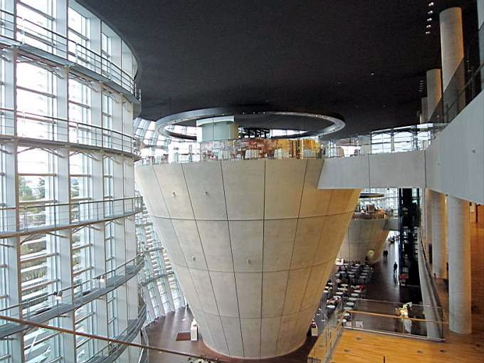 挑高的大廳中裝飾著2個巨大的倒圓錐塔,仔細一看上面竟然有休憩飲茶,原來這高低差一樓的兩個大圓錐塔,就是兩家國際知名的咖啡廳。