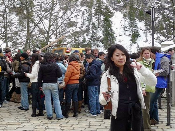 新天鵝堡是僅次於凡爾賽宮的「宮廷景點」,全年遊人如織,所以有一套相當有效率的管控方式因應:山腳購票、定時、取號碼,上山後依序入列、排隊等候入場,若逾時則電子柵門無法通過。