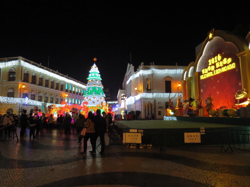 從大炮台下來後,大三巴牌坊前的街道擠滿著遊客,議事亭前地夜晚燈飾變化多,美不勝收!
