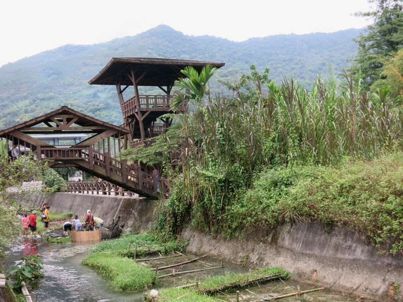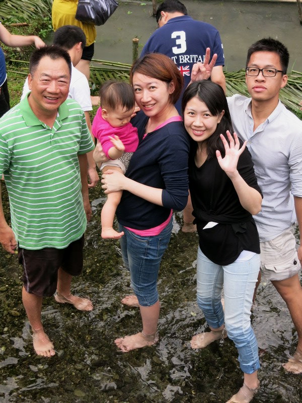 在綠新農園用過午餐後,旅行社安排在芙登溪體驗傳奇部落智慧漁法;阿公抱著梅寶貝也準備去戲水囉!