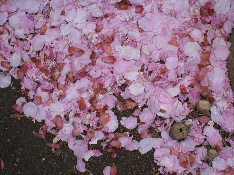 地面已堆積很多飄落的櫻花瓣,充滿著粉紅的夢幻感覺呢!